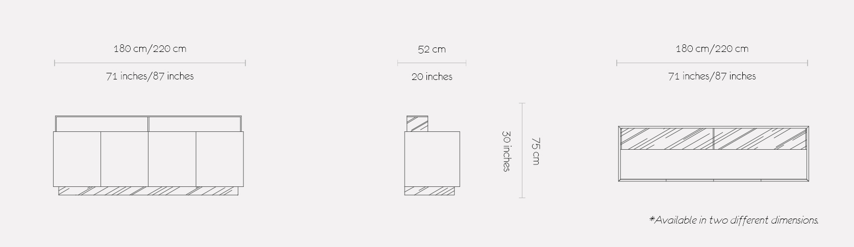 Inspired by a royal chest this clean line of cabinetry bears a secret. The hidden drawers adds to its simplistic yet elegant design a functional component. To personalize it to taste and functionality, the finishes of sides and top can be selected in any material from mirror, leather, wood and lacquer finishes which makes the COFRE a very versatile contemporary buffet.