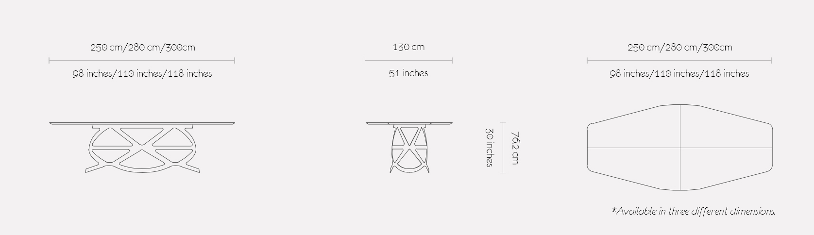 Our CROWN dining table consists of a laser cut metal base topped with a marble or wood finish of your choice. The confluent design of the base forms an exoskeleton-like structure that gives a subtle architectural touch and holds the floating top. The shape of the top is customizable from oval to hexagonal shape bevel-finished.