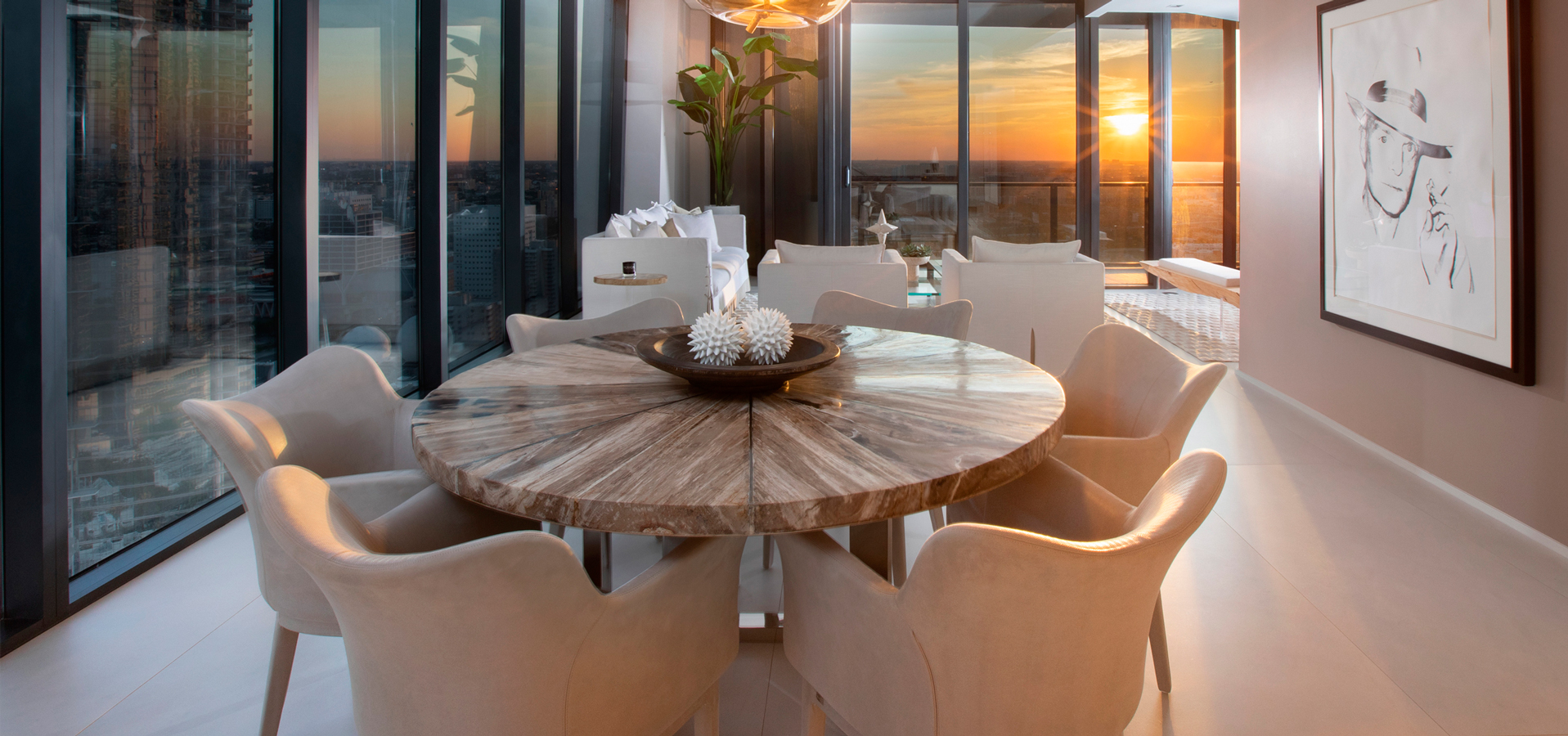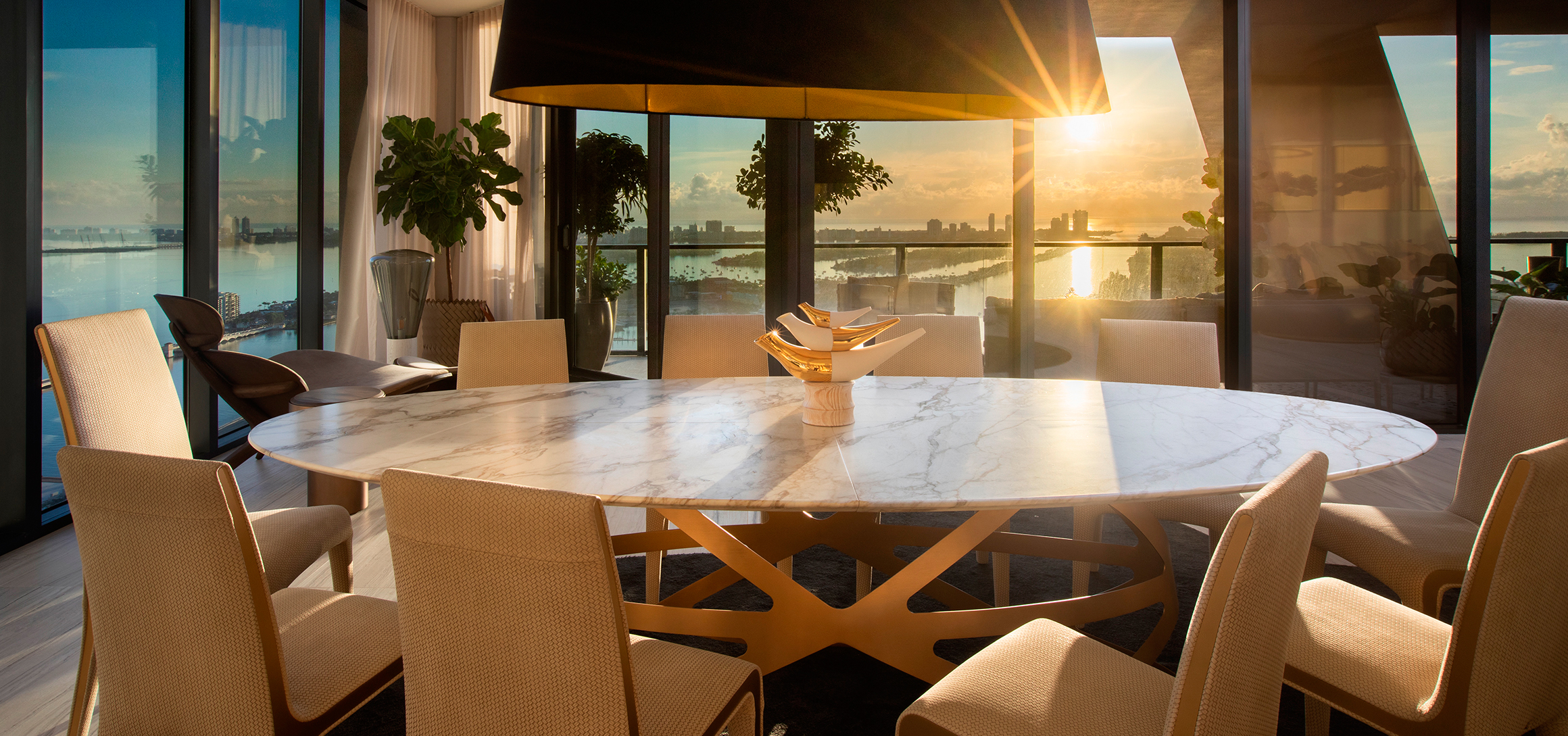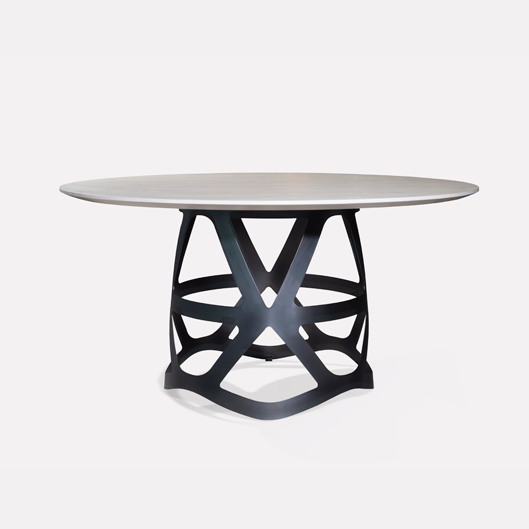 Our CROWN dining table consists of a laser cut metal base topped with a marble or wood finish of your choice. The confluent design of the base forms an exoskeleton-like structure that gives a subtle architectural touch and holds the floating top.