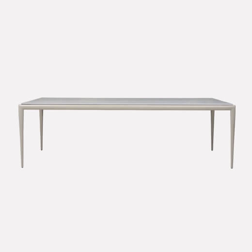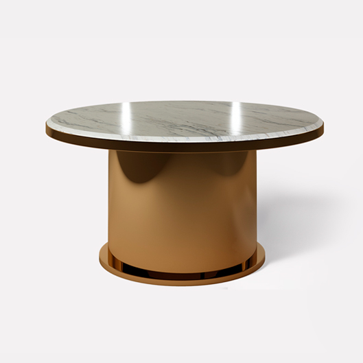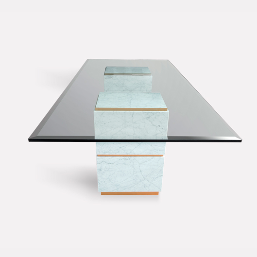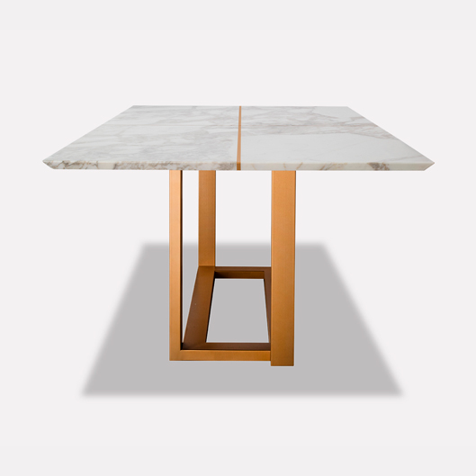 The appeal of the contemporary dining table TAVOLTA ROYAL lies in its harmonious combination of precious marble with noble metal. The thin metal lines are seamlessly carved into the marble top to adorn the surface of the table which rests on a confident yet light metal base. The design of the base with its off-set pillars give a subtle architectural element that connects to the solid marble top to form a sophisticated “T” view. Also available with two bases depending upon length and style choice.