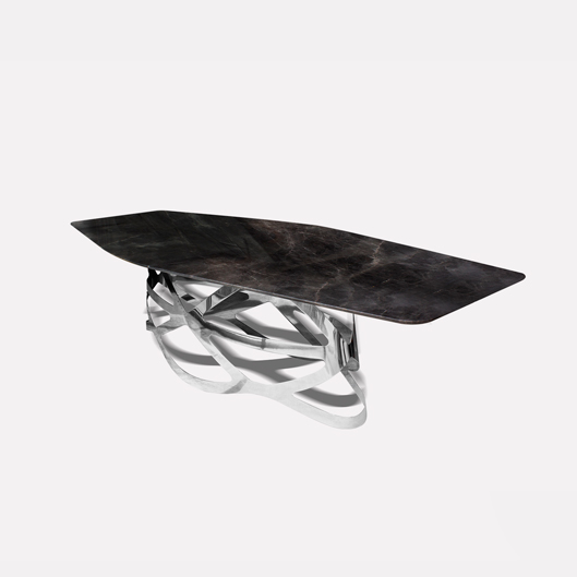 Our CROWN dining table consists of a laser cut metal base topped with a marble or wood finish of your choice. The confluent design of the base forms an exoskeleton-like structure that gives a subtle architectural touch and holds the floating top. The shape of the top is customizable from oval to hexagonal shape bevel-finished.