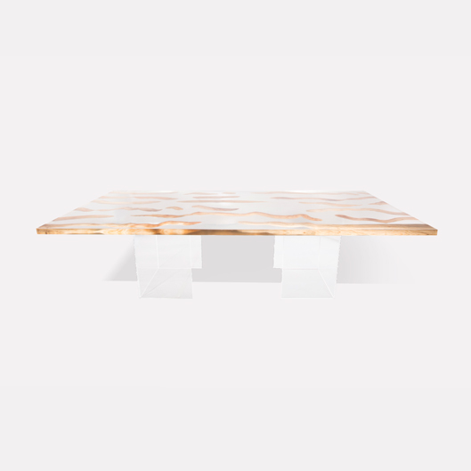 Nature and Innovation come together in this dining table as the naturally twisted Liana woods are floating in an extra clear lake of Resin and resting on a glass base. The straight shape of top and base provide the contemporary “invisible” background to have nature be the unique design element.