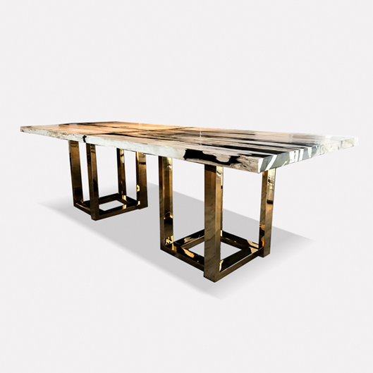 In Greek mythology, Medusa could turn her beholder into stone just by a look. For wood, this process takes millions of years resulting in a breathtaking beautifully dense material. Buried in the soil, the enclosure of metals and minerals during this natural transformation give each piece a unique set of colors and veins. Combined with the strong yet elegant metal base this unique material formed by nature is transformed into a luxurious contemporary dining table.