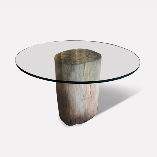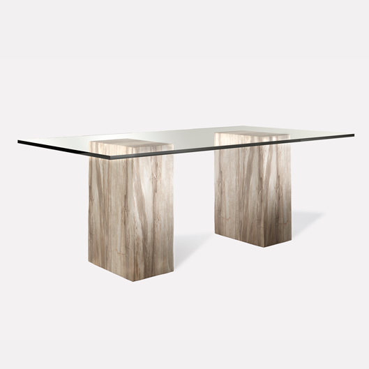 In Greek mythology, Medusa could turn her beholder into stone just by a look. For wood, this process takes millions of years resulting in a breathtaking beautifully dense material. Buried in the soil, the enclosure of metals and minerals during this natural transformation give each piece a unique set of colors and veins. Each pillar is carved out of a unique petrified trunk and has its own shades and characteristics. The combination with the glass top lets this precious material created by nature be the center part of attention.