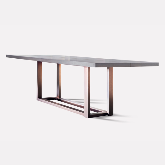 The appeal of the contemporary dining table TAVOLTA lies in its harmonious combination of warm wood with noble metal. The thin metal lines are seamlessly carved into the top to adorn the surface of the table which rests on a confident yet light metal base. The design of the base with its off-set pillars give a subtle architectural element that connects to the solid e top to form a sophisticated “T” view. Also available with two bases depending upon length and style choice.