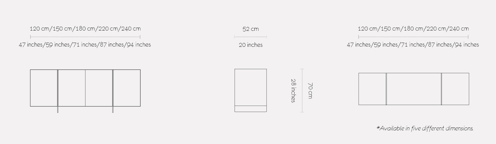This cleanly designed buffet shines through its combination of European oak and sleek inlayed lines of noble metal. The craftsmanship is shown in every detail of the woodwork as for instance the 45 degree cut edges.The interior distribution accomodates for silverware dravers and porcelaine shelves whitle the exterior doors keep the clean sophisticated look.