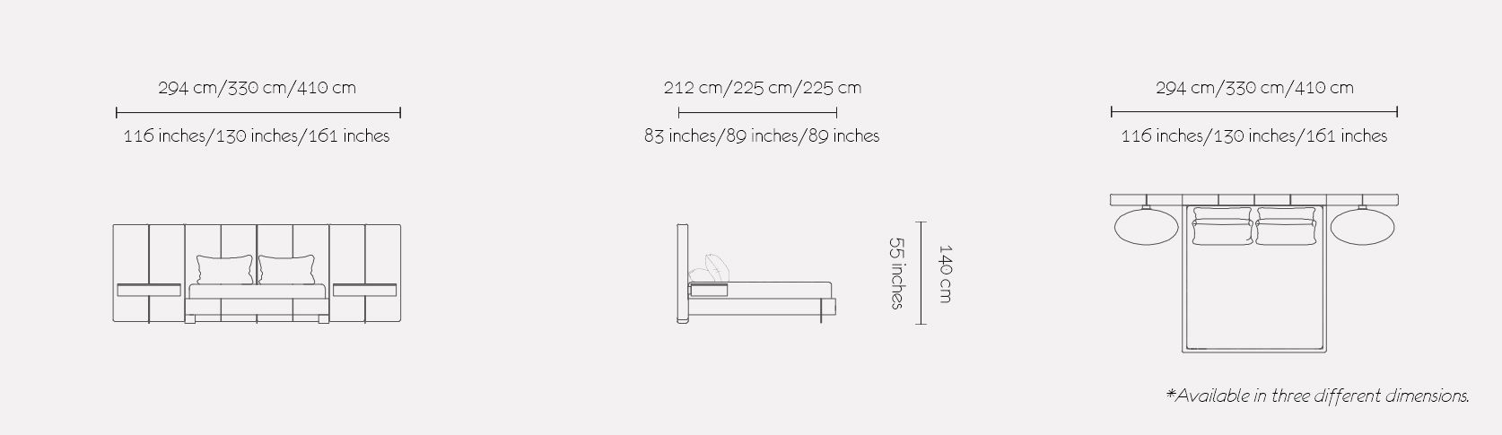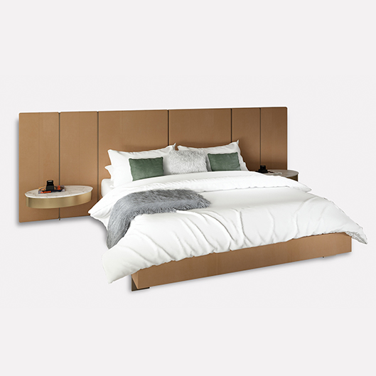 Feel like a movie star in this luxuriously upholstered bed with a oversized headboard. Its bold, self-assured personality rests on sleekly designed metal feet that go through the clean shape of the frame juxtaposing the noble metal and soft upholstery in the piece. A revealing pleat adds another element of sophistication giving testimony to the finest Italian craftsmanship that built this bed. The IMPERIAL edition features an extra wide headboard with integrated nightstands to achieve a hotel-like look & feel. The oval nightands have a unique opening mechanism with a revolveable marble top.