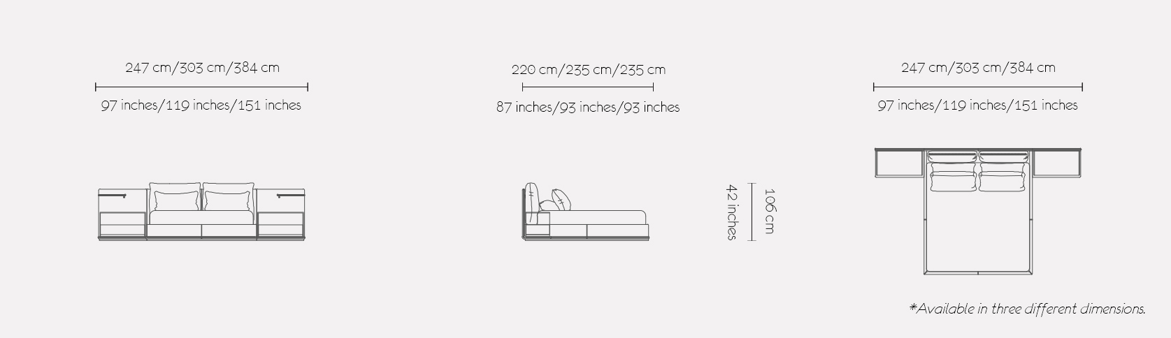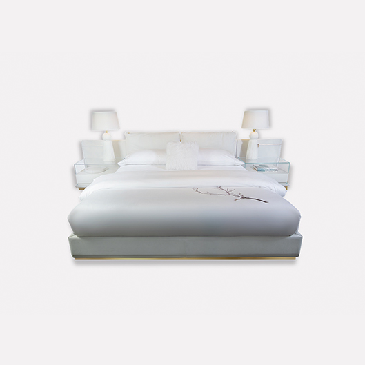 The love for details in fashion couture inspired this sleek refined bed with prolonged headboard and its oversized tailored zippers. The thinly designed frame is boosted with a headrest resembling two cushy oversized-pillows and extends to both sides to accommodate as backing and platform for the nightstands (not included) for an integrated hotel-suite look. A noble metal base surrounds the upholstery and adds a sophisticated touch for your bedroom.