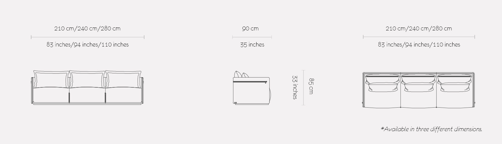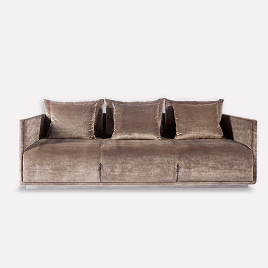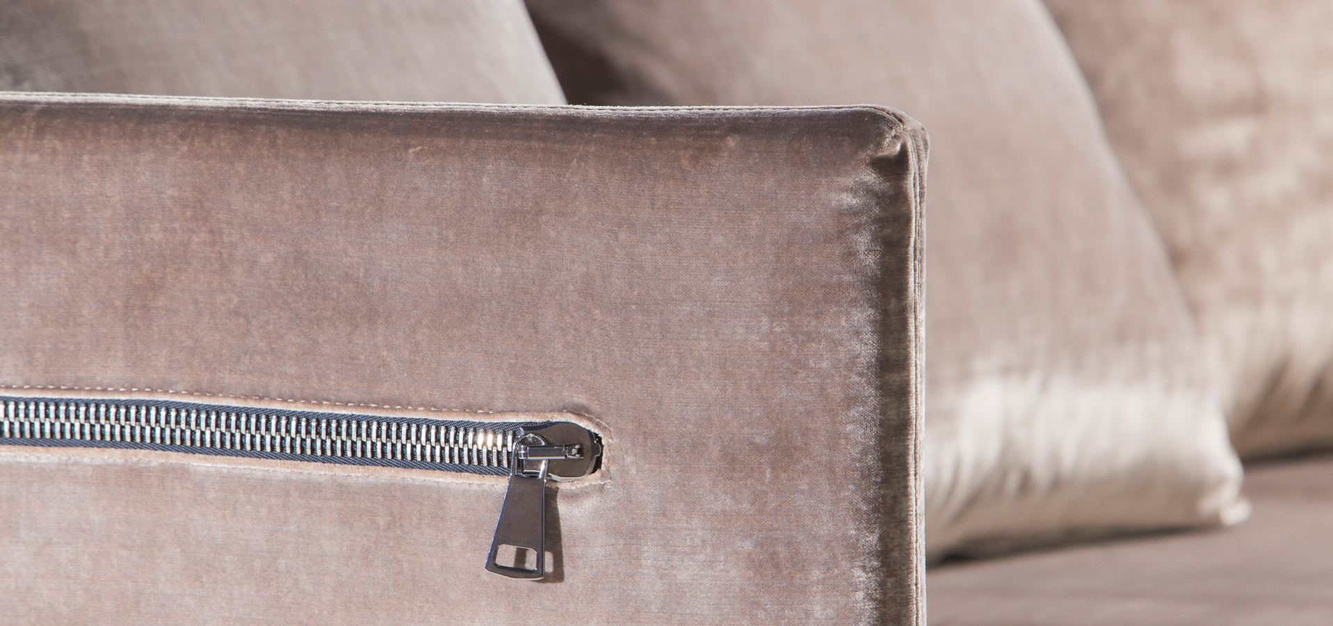 The love for details in fashion couture inspired this sleek refined sofa with its oversized tailored zippers. The geometric shape of its body with thinly designed armrests is softened by slightly rounded edges and rests on a noble metal base. The diligent workmanship shows in every stitch and makes the LAMPO sofa a luxurious statement for your living room.