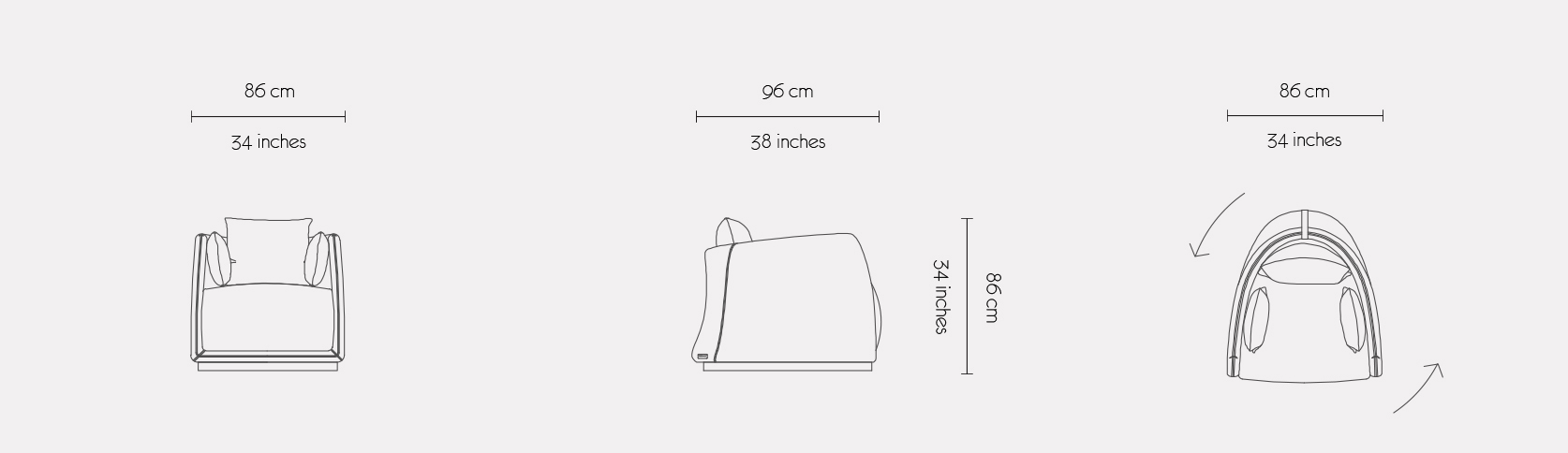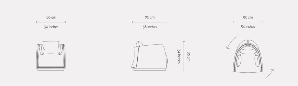 The design of the PALM BAY armchair features a unique semicircular double-curved body that grants firmness and elegance to this chair. The pleasantly curved but rigorous form flows into slim armrests that allow for a cozy seating space flanked by plush side and back pillows. Positioned on a swivel base, this armchair exudes comfort and luxury while fostering a more relaxed style.