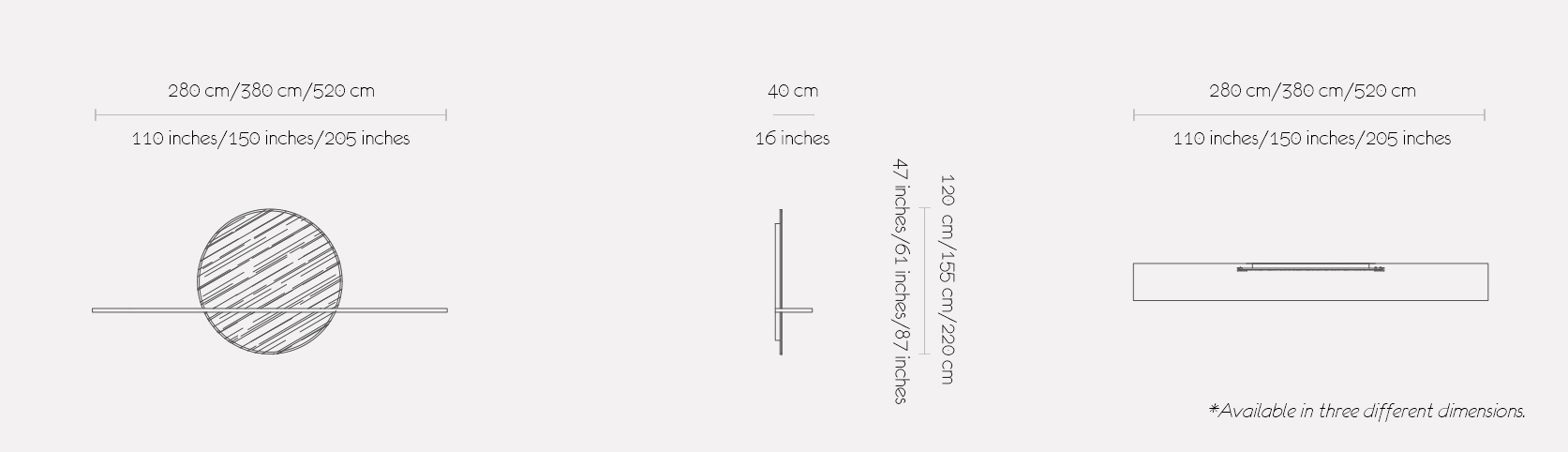 Circles have no beginning or end. They represent the eternal whole and in every culture are an archetypical symbol for the sun, the earth and the moon. This oversized mirror is illuminated from the back with an LED halo with metal details on the site with an integrated long shelf to serve as a console.