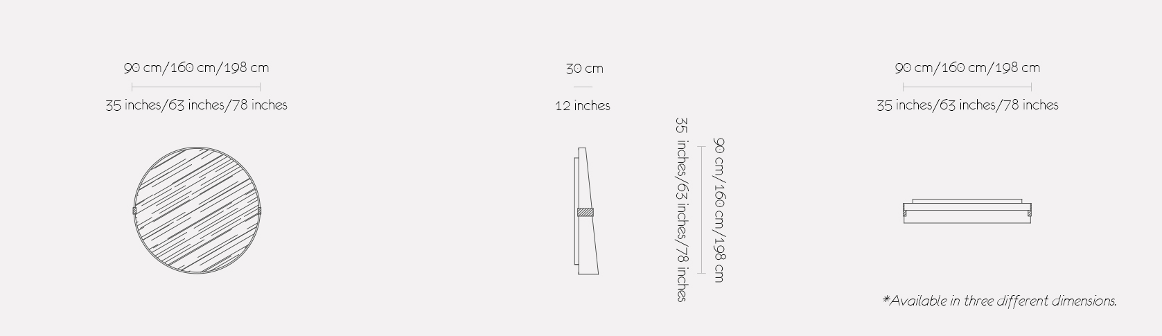 Circles have no beginning or end. They represent the eternal whole and in every culture are an archetypical symbol for the sun, the earth, the moon. This oversized mirror with a three dimensional frame is illuminated from the back with an LED halo and wrapped in leather with metal details on the side.